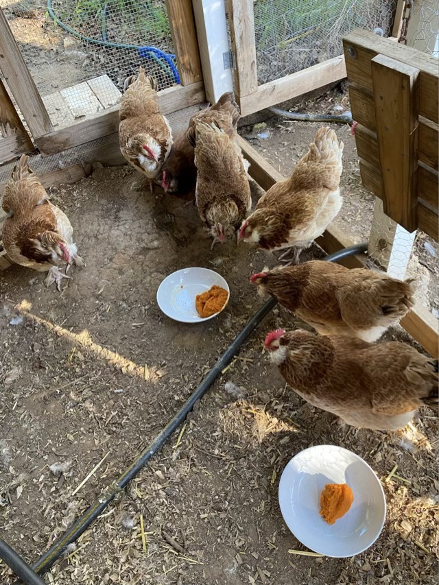 I put out some canned pumpkin for the chickens to see if it helps with the digestive issues that start up when they start laying. (They’ve been laying again for awhile, but a couple still have dirty tail feathers.) They love fresh pumpkin, but when presented with canned, they all but accused me of attempted poison.
