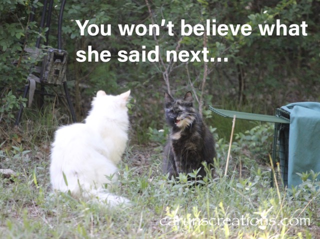 It is getting harder and harder to catch unfixed cats from my neighbor’s colony. I sat out for four hours one day and didn’t see a single un-notched right ear. I know there is a short haired black cat that roams the meadow, I’ve seen it on the trail cam, but it either doesn’t like tuna in oil, or knows when I am watching. It wasn’t a completely wasted day; I took my camera with me and did a fixed cat photo shoot. So now you get cat photos and memes. You’re welcome.