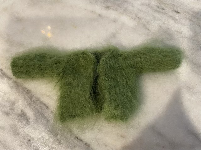 There was more mystery about the little cardigan; the inside was very, very fuzzy. Was it brushed? What was going on? Some insight occurred when I knit the sleeve. The yarn had a long halo (fibers that stick out from the spun yarn), and when knitting the garter stitch, those long fibers hung out on the purl side of the garment because of the mechanics of forming the stitches. So the inside was significantly more fuzzy than the outside. Some time rumbling about the bottom of several yarn stashes probably helped the condition as well. After finishing the missing sleeve and blocking the cardigan, I decided the fuzzy must be embraced. I turned the sweater inside out and gave it a brush to raise and align the fibers. It is so fuzzy, the inside out seams don’t even show.