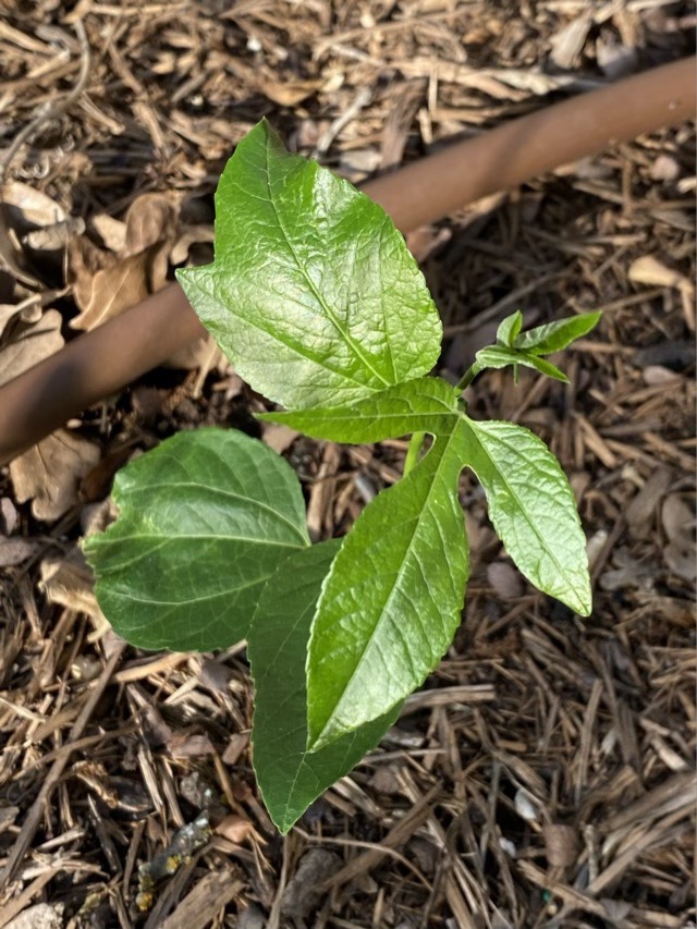 Of the three passion vines we planted last year, it seemed only one survived the winter’s freeze. Then I noticed a leaf. It wasn’t the same kind of leaf as the surviving passion vine, but it looked vaguely familiar. As we have had many plant volunteers turn out quite well, I am leaving (leafing, haha) this one to see what happens. A few leaves later, and it looks like it may be a passionflower. The three-lobed leaf looks like the other variety we planted, just about two feet from either of the original planting locations. Either one of the seeds took, or the roots are spreaders. I’ll take it!