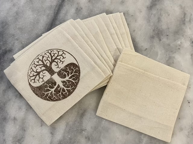 I wanted 4” square pouches, so tore an 11” strip of washed and ironed unbleached cotton muslin, marked 4.5” sections along the strip, and stamped my logo in the center of each section. To stamp, I squirted some fabric paint into a bowl, then loaded a sponge brush with paint to apply the paint to the stamp.
