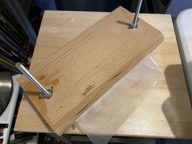 I recently read an article on four-leaf clovers, and one finder suggested looking for squares amongst the triangles made by three-leaf clovers. Apparently this works. Day 2 of thinking of squares and triangles, I spot one. I carefully laid it flat between layers of wax paper and put it in one of my book presses that my Dad helped me make years and years ago.