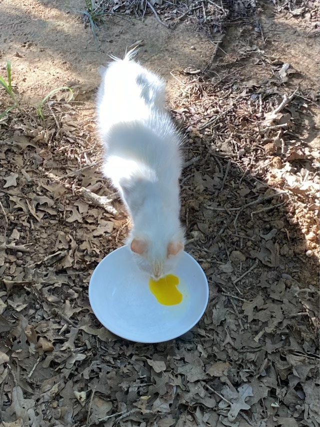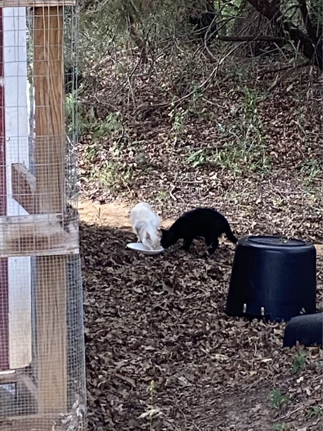 Our local pet shelters strongly recommend “If you feed them, get them spayed or neutered.” So if I helped take them out of the kitten making business, I don’t feel guilty giving them an occasional treat. Their main meal station is still my neighbor’s house, but Mr Tom is so pretty. Which is good, because his social skills need work. He is charming enough to get an egg now and again, though. Maybe one day he’ll stop greeting me with a hiss, then a meow. The hiss has no accompanying body language indicating fear or aggression (tail is high, head is high). Maybe that’s just his name for me. “Devil woman, give me treats.” Hm.