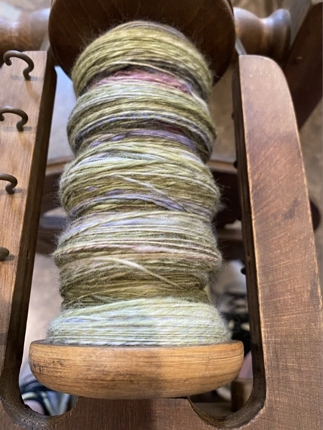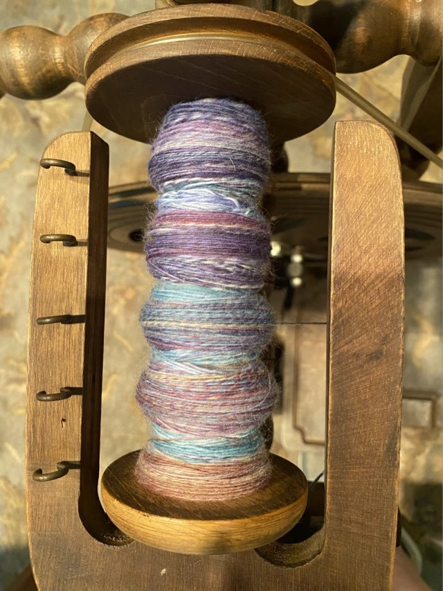 My spinning speed on the wheel is about the same as on a drop spindle right now, but I am obsessed and can sit and treadle longer than I can stand and spin. The gentle swoosh of the wheel spinning is also soothing. Until I get a squeak. It doesn’t bother me (shockingly), but does set other people’s teeth on edge. I ask my eagle eared eldest to listen for the source of the squeak, then I apply a little oil. Off I go again. I even am making myself switch sides to balance the stresses on my body. I find it harder to treadle with my left foot and draft out to my right, but it is getting better!