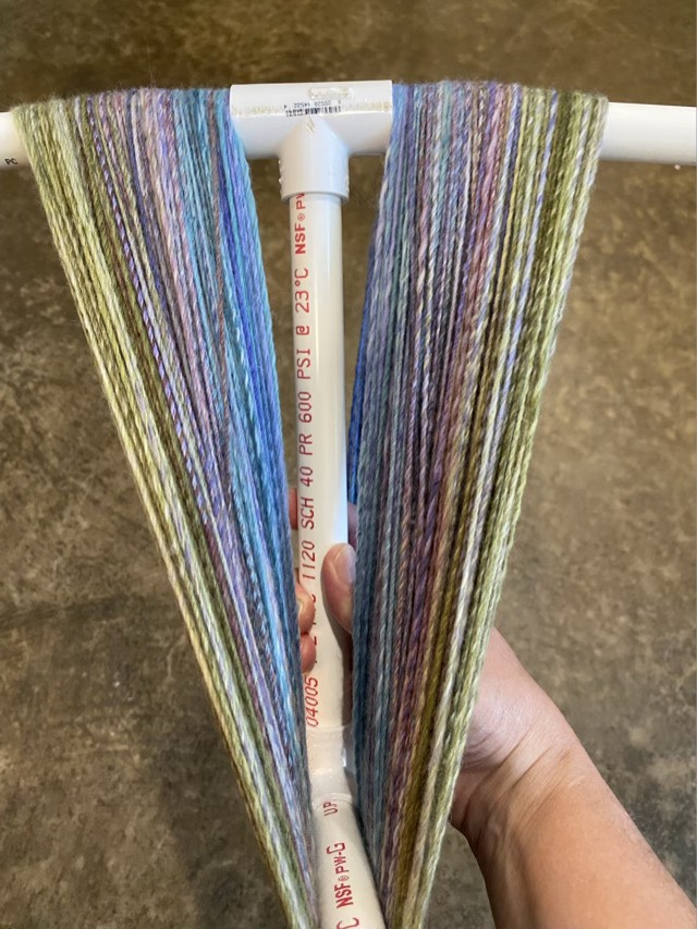 After plying my hand dyed chain ply yarn, I transferred it to my PVC niddy noddy and soaked it with water to set the twist.