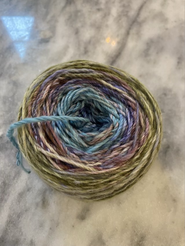 Some spinners set the twist in their singles before plying. I usually can’t wait, and the hand dyed single I spun on the Befra Willy Spinning wheel was no exception. I couldn’t even wait a day. As soon as the last of the roving twisted into yarn, I had the bobbin off, mounted on the bobbin holder, and was plying the newly spun yarn. I chose to chain ply to keep the color change consistent with the spun singles. Chain plying results in a three ply yarn. If you have made a chain in crochet, or shortened a long rope after tying off a horse, it is a similar concept, but with bigger loops. It took me 2 hours to ply the same amount of yarn it took me four days to spin, and I did it all in one go. (Can you say obsessed?)