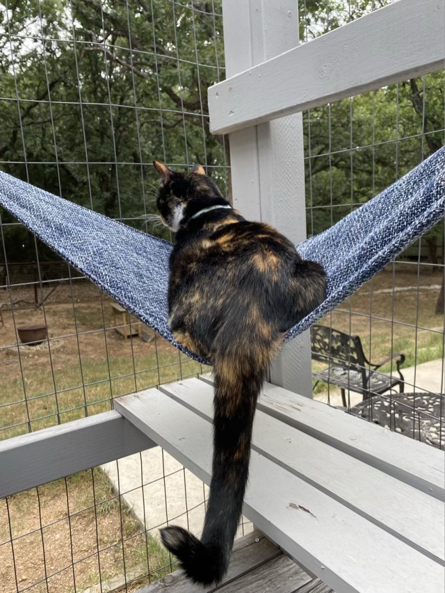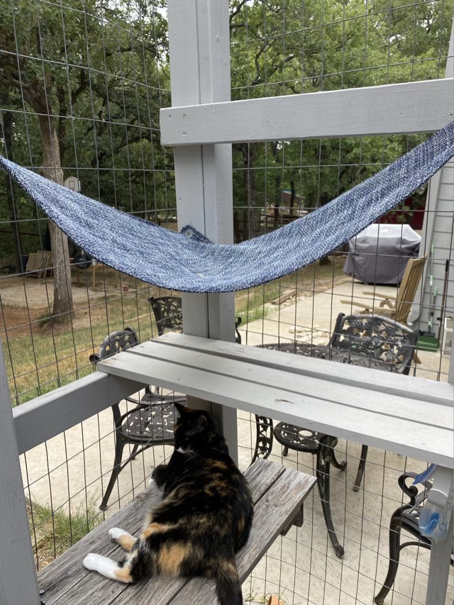 One of the commercial cat hammocks I had in the catio broke (it really wasn’t designed for outdoor use and degraded in the sunlight). I had what I thought was a brilliant idea to make a triangular hammock to fit a corner.