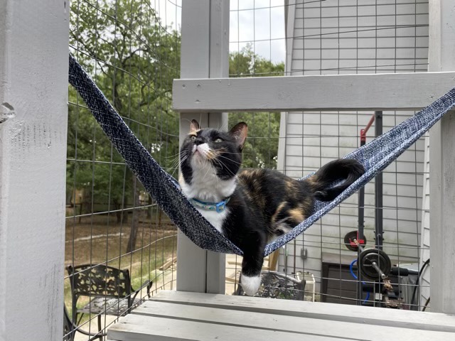The old hammock was square and needed support for all four corners. A triangular hammock would only need three supports. I used a large washer and screw to attach the hammock to the wood, and originally had it flat. Here is where the physics part comes in. The fabric sags when weight is applied. The hypotenuse of the triangle sagged too much and made a slide rather than a hammock when the corners were all at the same height. It took some experimentation to get the corners at the right heights so a pouch formed to hold a cat comfortably. My cat was remarkably patient with me putting her in and out of the hammock.