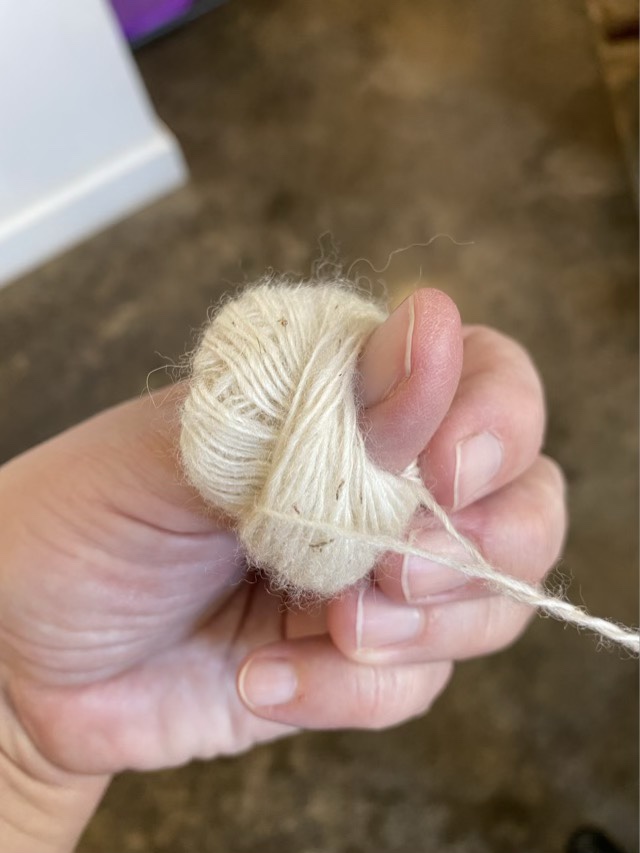 By keeping the center of the ball open with a thumb or finger, the ball cannot collapse upon itself as you unwind. Here is a short video (with cat) showing how the two ends of the yarn come off the ball. This is particularly helpful when making a two-ply yarn from a single ball of single spun yarn.