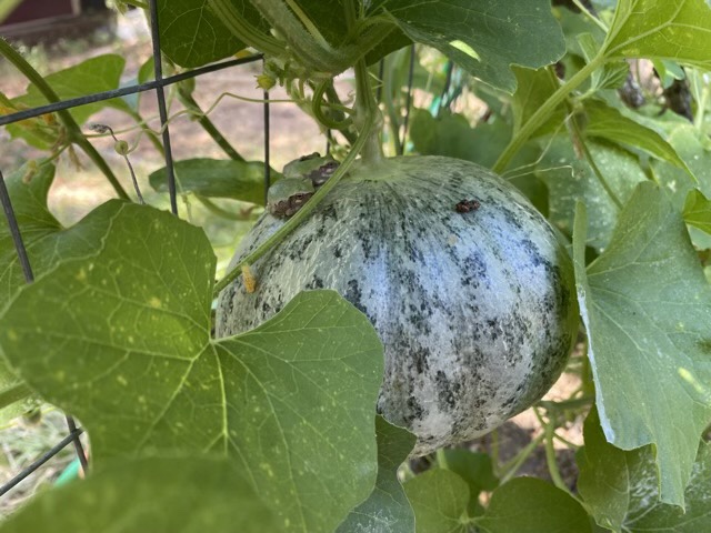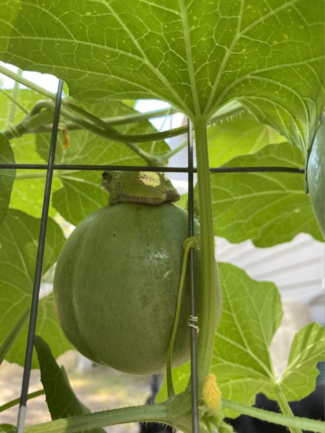 We have melons on the vine! And diligent guardians watching out for bugs.