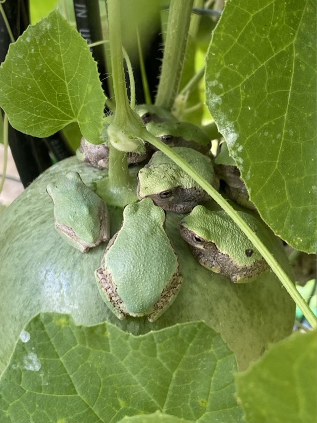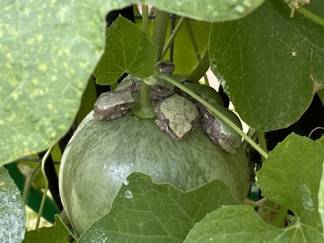 After taking the pictures, I did tie up some netting slings, then sprayed the bottom of the netting with Neem oil, where the frogs can’t patrol. Then I found the frog convention.