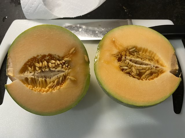 First melon harvested! The frogs did their job keeping the bugs down. I’ve been monitoring the bottom of this one and noticed a crack. But it was an untouched area, no sign of insect nibbles.