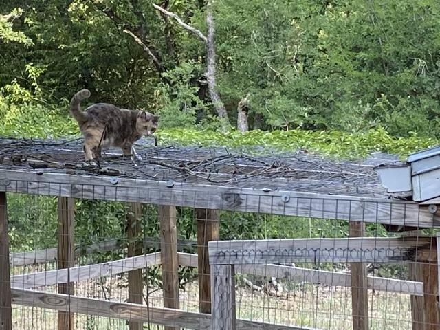 We originally put welded wire no climb fencing on the top of the chicken’s run to keep out hawks. It also works to keep out cats. Or as a platform for cat TV, depending on your perspective.