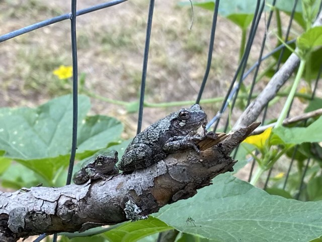 My stock tank garden really is a frog haven, with the little pond (old dish), shade (melon vines and basil), food (bugs that eat my melons), and rest areas (branches to lead the vines to the fence). I thought these two were quite cute.