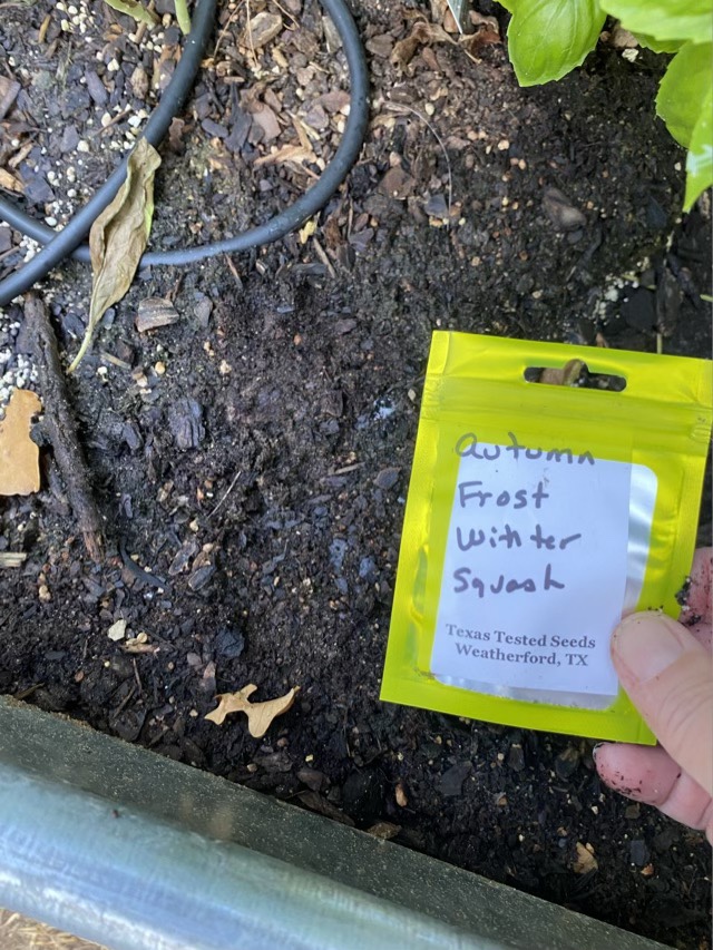 On a lark, I planted some winter squash seeds in my stock tank garden bed. There should be enough time before our first freeze for the squash to develop (I hope), and the melons have been doing so well there, maybe squash will too.