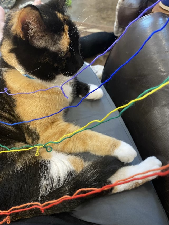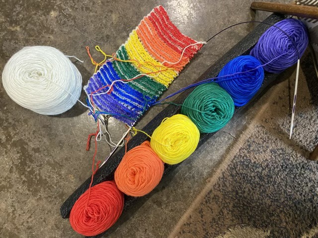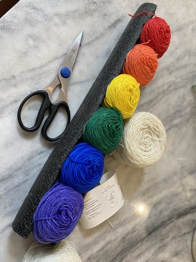 The colors came in mini skeins, which, once they are wound into cakes, are a perfect size for a pool noodle clamp. As I knit the colored rows, I do need to watch carefully which way to route the yarn, but if I do mess up, I can take the tangled yarn out of the clamp, untangle, and slide it back in place. No worries.