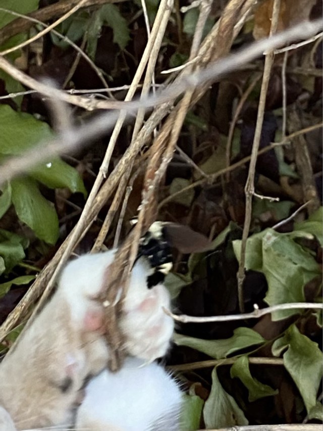 Blurry photo of cat paws pulling down a honeysuckle vine while the newly emerged Snowberry Clearwing tries to valiantly escape