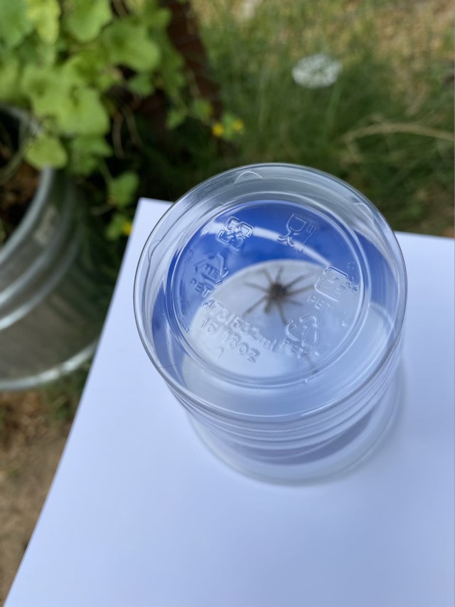 This grass spider was released near the stock tank garden, promoted to captain of the guardian army, and tasked with ejecting (by whatever means necessary) the unfriendlies that would eat the produce.