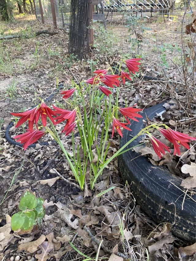 Our big rain was over a week ago. After a summer of 100 degrees everyday and no rain, the fields and most yards were yellow. One big gusher and a few days and almost everything is green again. We did have some losses, and I think the accounting is not finished, but I was surprised by rain lilies and school house lilies this week.