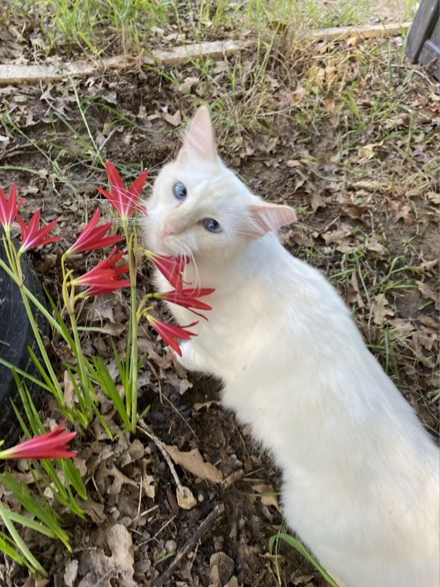 Drummond’s Rain Lily (aka Giant Rain Lily)Drummond’s Rain Lily in three stages (not picked, just growing that close)Schoolhouse lilies (aka oxblood or surprise lilies)Mr Tom was not interested in posing with the lilies, so the picture is blurry; he was much more interested in scritches