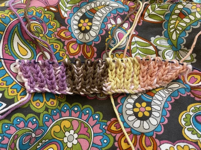 I know Grandma’s blanket isn’t done yet, but I had to scratch a brain itch. I have an idea for a brioche knit using vertical stripes of color, and I just had to start a prototype. This is scrap cotton yarn (yup, when I’ve done my experiments, it will go in the washcloth bin).