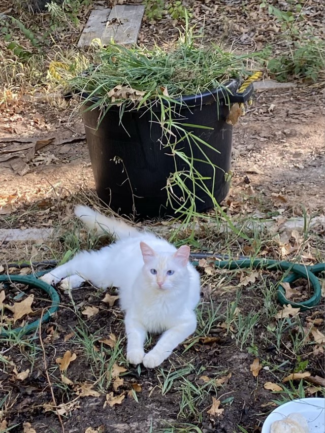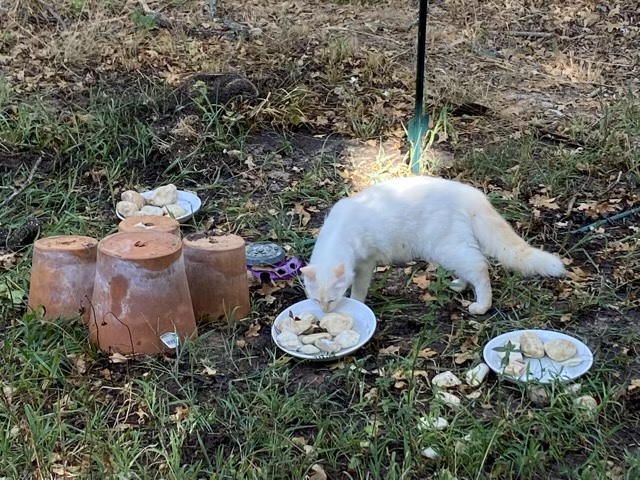 My mint and strawberry patch fell to a field of grass. It was watered regularly, but maybe it was the heat, or that the trees over grew the area and there is more shade than I thought. Either way, I finally decided to pull the grass in the “cool” of the morning (if you can call 80 degrees at 7am cool). The water bowls I put out in the sprinkler area were doing well providing wildlife and cats with water, so I put another bowl with rocks out (so the frogs and bees have landing areas), and turned over a few terra cotta pots to provide moist frog cover. It isn’t any kind of work of art (yet), but it is functional and has potential.