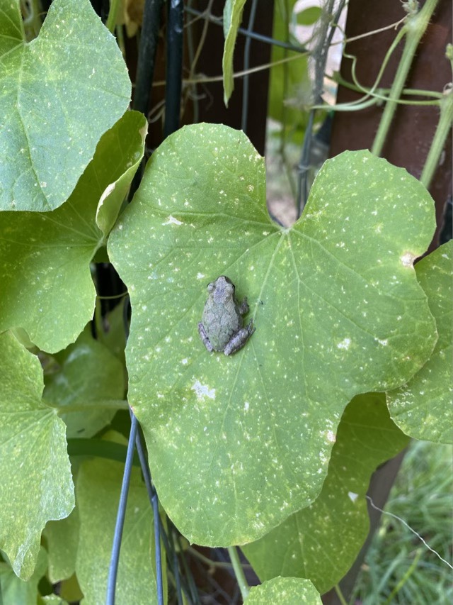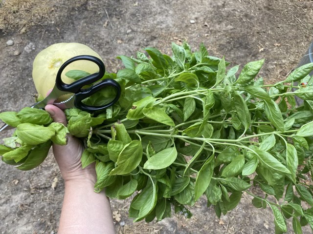 The melon vines have produced a continuous harvest of ripe fruit, and the basil is growing nicely. I collected a ripe melon, and a large amount of basil! Since those are the only things I seem to be able to grow, that is all I planted this year. The new stock tank garden is doing better than the small multiple container garden from last year. The addition of the frog army (attracted by adding a standing water dish), has helped yields as well.