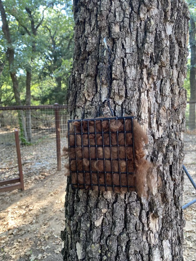 The birds may utilize it, but I’m really putting it out for our squirrels. I have been strewing alpaca fiber across the branches and bark of the trees. This seems a much neater option.