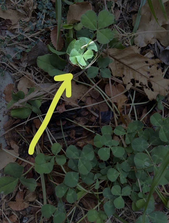 Our very hot, very dry summer killed off most of our clover. Most, but not all. One small clump managed to survive by setting root under the watering manifold (which has a small leak so the soil is damp beneath). The small collection of three-leaved clover managed to provide me with a four-leaf. I did not pick it when I found it, which was good because it hadn’t fully grown. Later the fourth leaf filled out better. Can you spot it in the photo below? Remember to think squares as you are looking, as opposed to triangles.