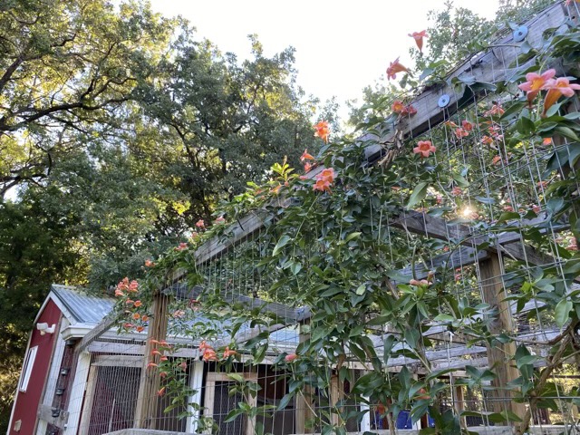 The crossvine we planted at the corner of the chicken runs has come into its own. It has happily spread vines across the welded wire and is in bloom. My eldest even spotted a hummingbird flitting from flower to flower! We chose this location because it gets the most sun of anywhere in the yard, and to provide shade for the chickens in the hot summer. The vine is performing admirably.