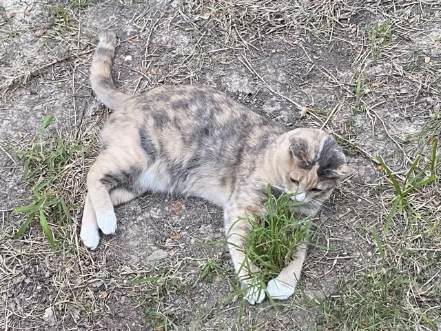 The summer left the grass in sad condition; the following rains perked up the native varieties we’ve been planting but showed us how much St Augustine grass was still in the mix as it died off the hardest. (That really doesn’t make me sad, I detest St Aug grass.) There is one particular healthy clump that Sophie the cat likes to “hide” behind. I didn’t get the photo of her stalking pose, but did capture the moment she thought the tuft should die.