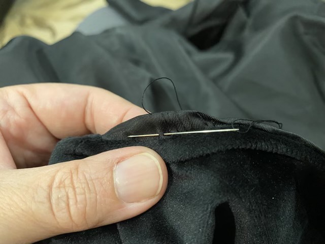 To fold the lining in and keep it there, it works well to alternate small stitches near the original seam, then at the top of the original fold. Keep these stitches loose for four or five repeats, then gently pull the stitches tight. The fabric folds down and is secured!