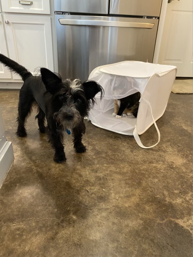 Ok, no, Missy knows exactly where the cat is, her senses of smell and hearing are quite good. It is more likely that she is looking at me to see if I will throw the ball at my feet (not pictured). It is common for Izzy the cat to “hide” in the laundry basket given any opportunity.