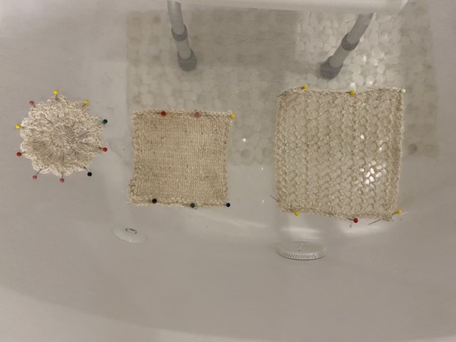 I’m thinking of starting up another long term project, but that is worked in small sections. I’ll give a big reveal later. For now, here are alpaca swatches drying over the tub to give you a hint (or thoroughly confuse).