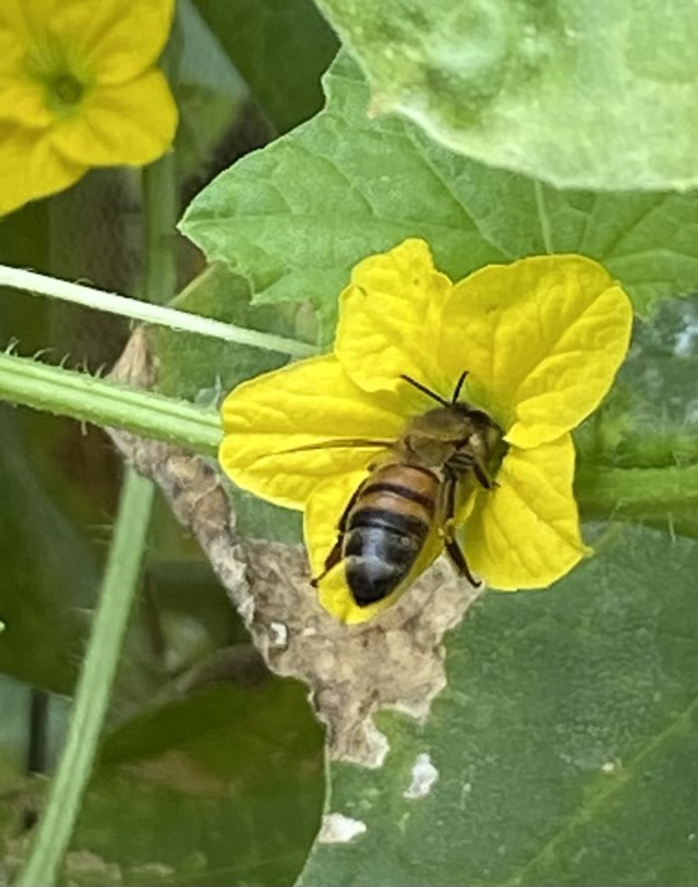 There are currently about 10 melons developing on the vines I planted at the beginning of Spring. This is the second round of set melons for these vines. The pollinators have been busy!