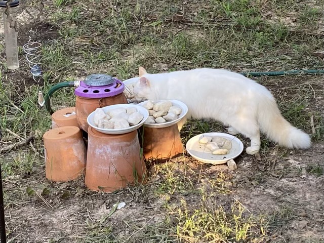 I needed to shift the pots and water dishes in the future moss garden (big dreams), so I could trim down the scraggly grass. As I stacked I like the look, so deliberately arranged so I had a cascading fountain of sorts (very crude, but it is the beginning of an idea).