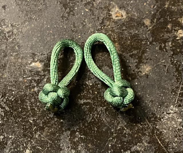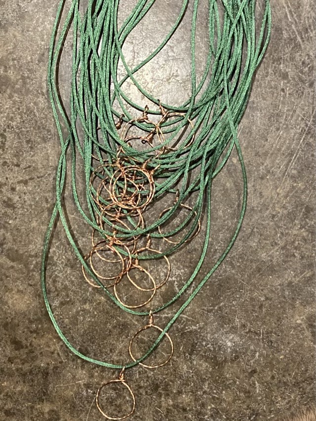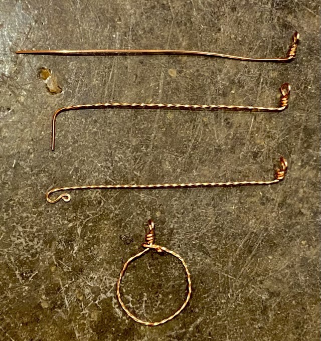 I thought I would make up stitch marker necklaces for the stitch marker swap at the Fiber Fest. I’m good with wire, but not entirely sure that wire is the right material for hand made stitch markers. It seems they would catch on the yarn. So I made holders instead. I have a large spool of square copper wire (20 gauge) that looks awesome twisted. I used satin cord for the necklaces with a simple slide knot so the length is adjustable.