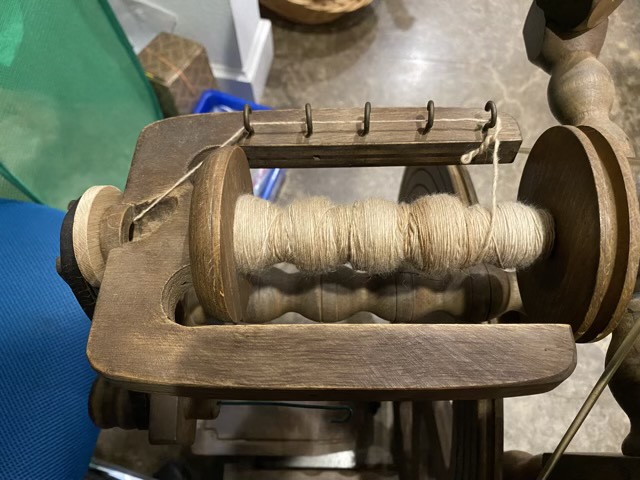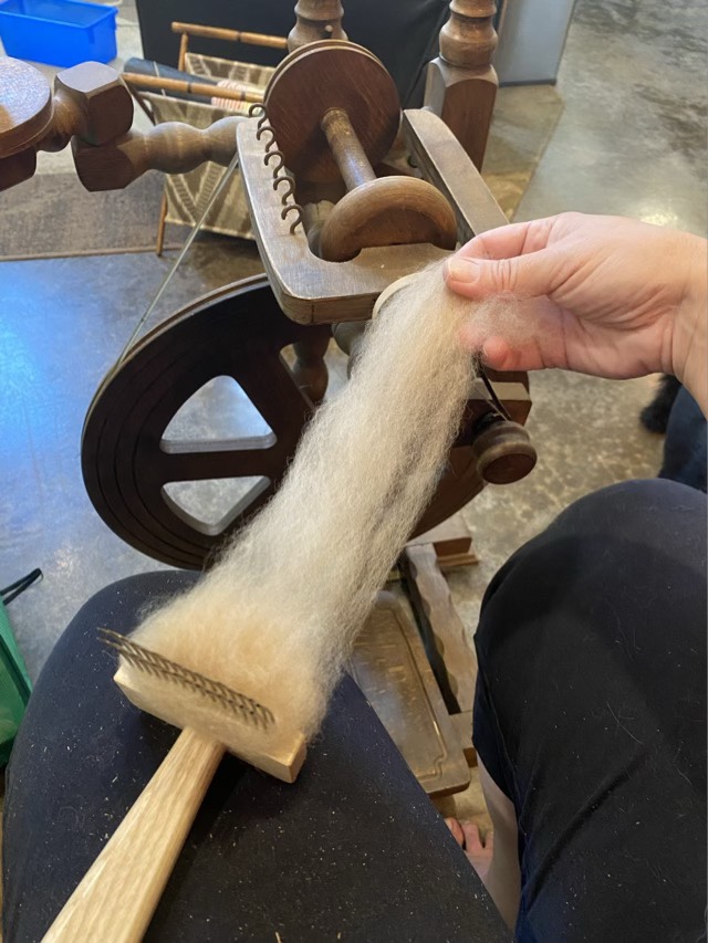 I tried spinning directly off the comb, but my skills are not that advanced yet, so I pulled off the fiber then spun on my vintage Befra Willy wheel. I now see how the yarn on a Irish tension wheel (flyer is slowed down) has to be thicker. There is more strain on the yarn and thinner yarns snap. I’m still pleased with the thickness of the yarn for multipurpose projects, but this will not be lace yarn.