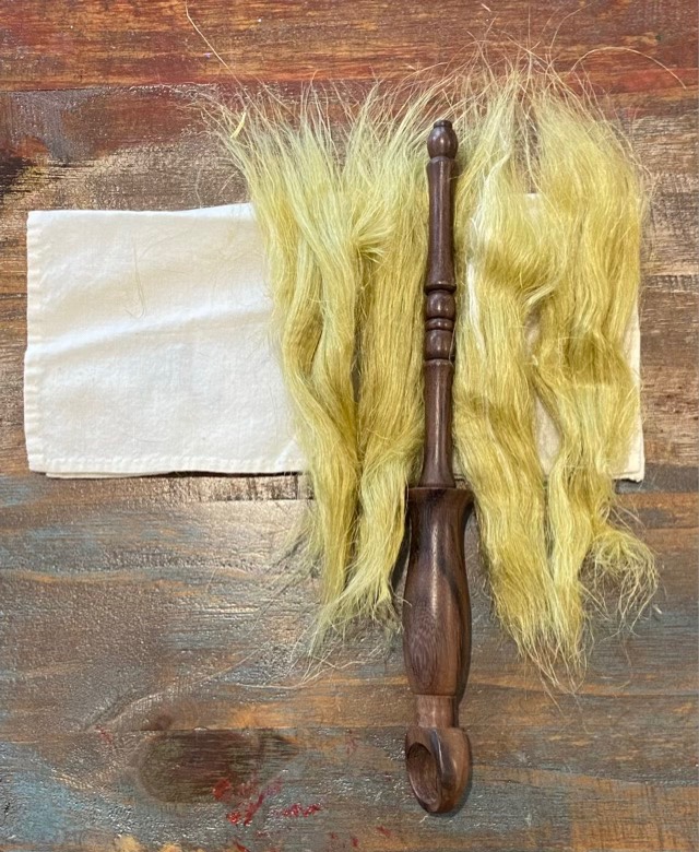 Flax fibers aligned on a handkerchief with distaffDressed distaff with flax and long shaft top whorl spindle