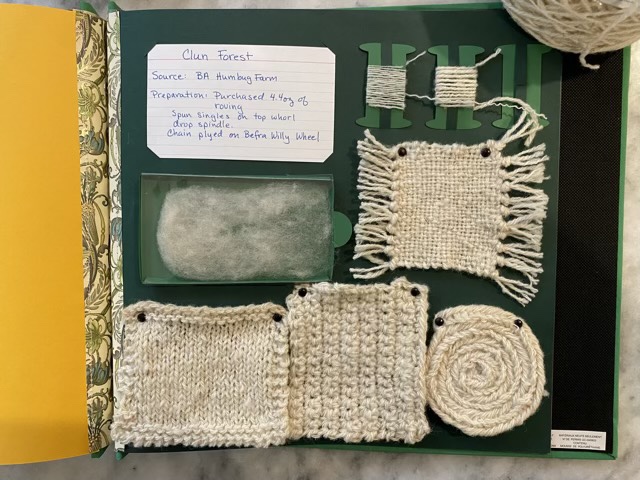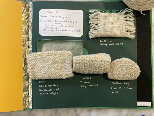 I have finished my Clun Forest hand work samples and mounted them on a page in my fiber book. I made swatches by knitting, crochet, nålbinding, and weaving.