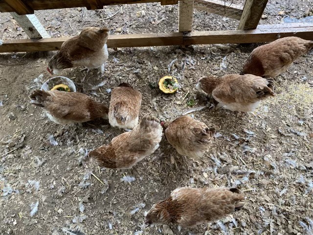 We’ve been having some rain. We need the moisture, but because it is November, it is a cold rain. Rather than scattering the scratch out in the muddy runs, the hens get their treats under the overhang.