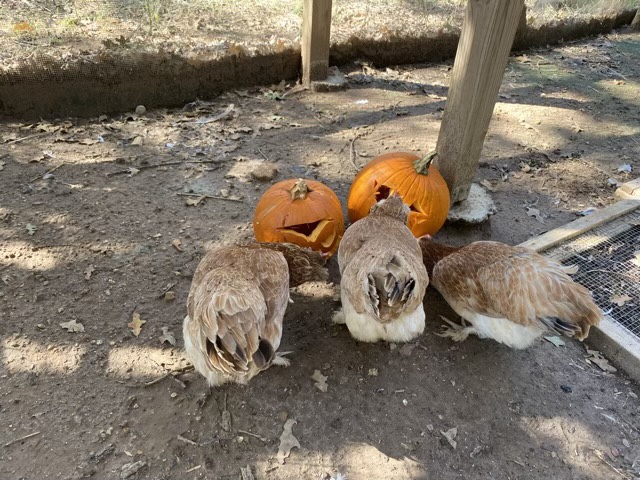 The annual pumpkin carve and hen feeding was another success. Rather than carve our pumpkins early and risk rot, we carve them on Halloween then take them out to the chickens the next day.