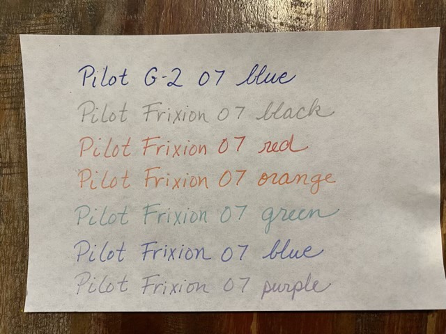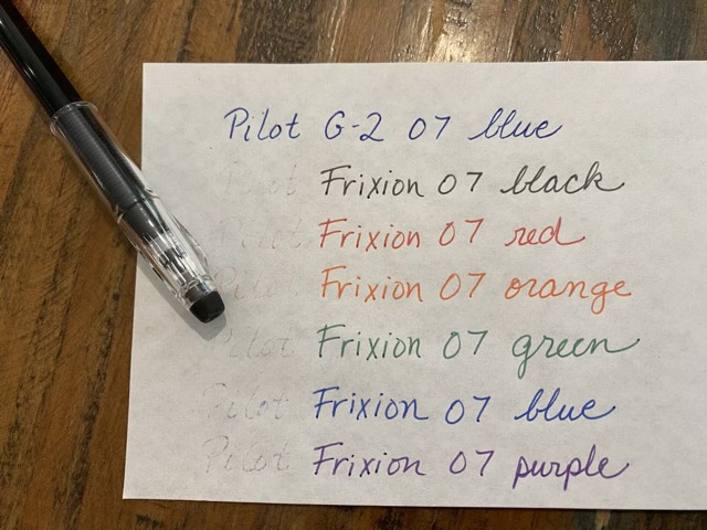 The regular pen ink behaved as expected, with no change after exposure to heat or cold. The Frixion ink does disappear when “erased” with the attached eraser, but also when subjected to 1 minute on high in the microwave. We found 1 minute to be the minimum time required. The best part is that when the paper is placed in the freezer, all the ink reappears! There is some fading, but it is all quite readable. I have cycled the paper four times through the heat/cold process, and the writing is still visible after a couple hours in the freezer.