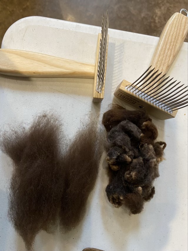The fleece was dry in a few hours, and I was able to comb it in preparation for spinning. There is more waste when combing, but the waste contains the nepps and vegetable bits that are not desirable in spinning. I put the waste out in the compost bin.