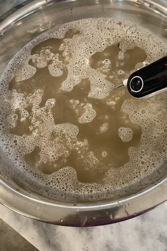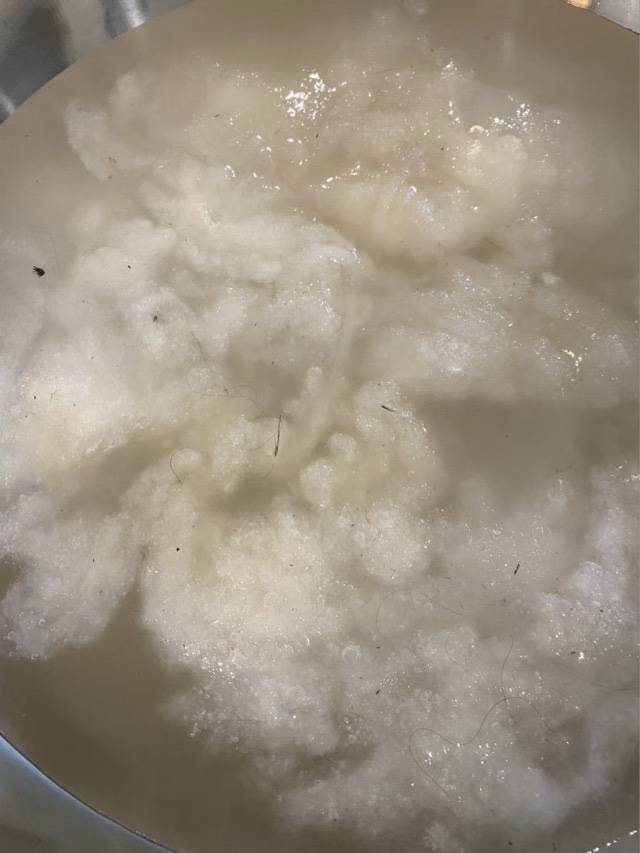 I scoured the wool with Amway LOC (taking a risk because this is fine wool, but the other scouring soap is on my wish list) at about 125 degrees F, letting it soak for 15 minutes in the same temperature water so the lanolin doesn’t redeposit.