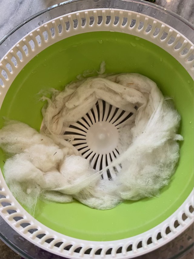 I sacrificed my salad spinner to the cause. I haven’t used it for salad in over two years, and it does a lovely job getting most of the water out of the rinsed fleece.