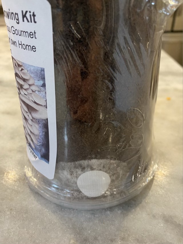 The instructions on the package say to leave the cellophane on until the entire surface is white. When I bought the kit, there was no white to be seen, just a tub of brown. Progress! I’m overly enthused about propagating fungus.