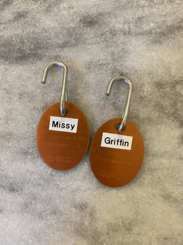 With updated rabies vaccines, our dogs received new tags as well. I stopped getting name tags made several years ago. The jingle of the two metal tags drives me up a wall. I’ve tried a number of methods to reduce the jingle: muffling with a layer of leather, riveting the name tag onto the collar, writing on the collar in sharpie, engraving the back of the rabies tag. The leather picked up a funk, the riveted name tags are difficult to put on the madrigal type collars I prefer, the Sharpie fades, and the hand engraving is not as neat as I would like (it is on my bucket list to learn to hand engrave neatly). This year, I’m trying the label maker. I’m not sure how long the stickers will stick, but they are easy to read, easy to apply, and don’t amplify the jingle. I used my label maker with the smallest type set, trimmed the excess, and stuck them on the back of the rabies tag. I added my phone number as well, but am not about to put that image out in the web.