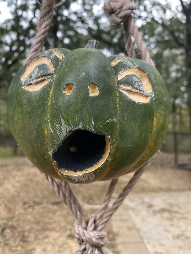 “Midnight” pumpkin carved with eyes, nostrils, and mouthCarved pumpkin installed over the squirrel feeder