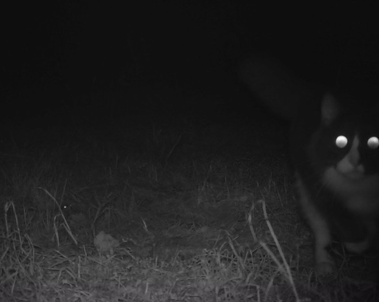 The trail cam mostly had shots of waving dry grasses (so many pics), but there were a few cat photo bombs, and this one above, with the cat wide-eyed and running, and the slight glint of the eyes of a toad on the left side of the picture. Is this the toad’s home? Was it defending it? Or was the cat running from something else? Hm.
